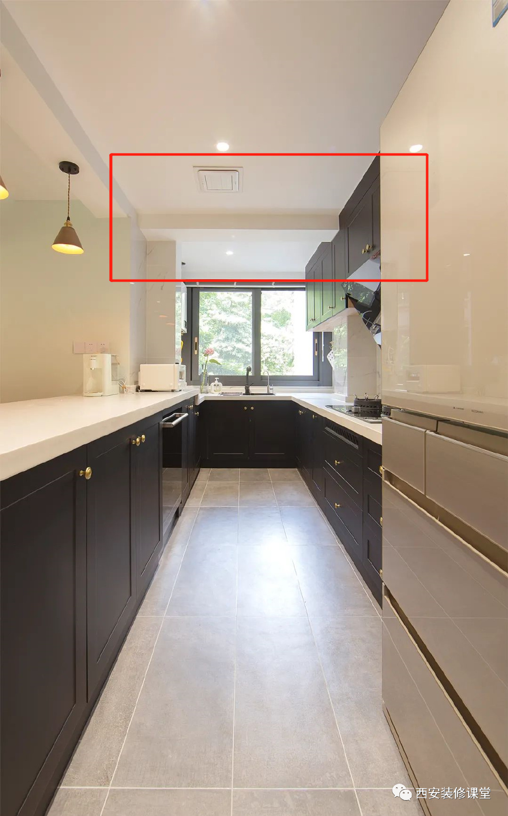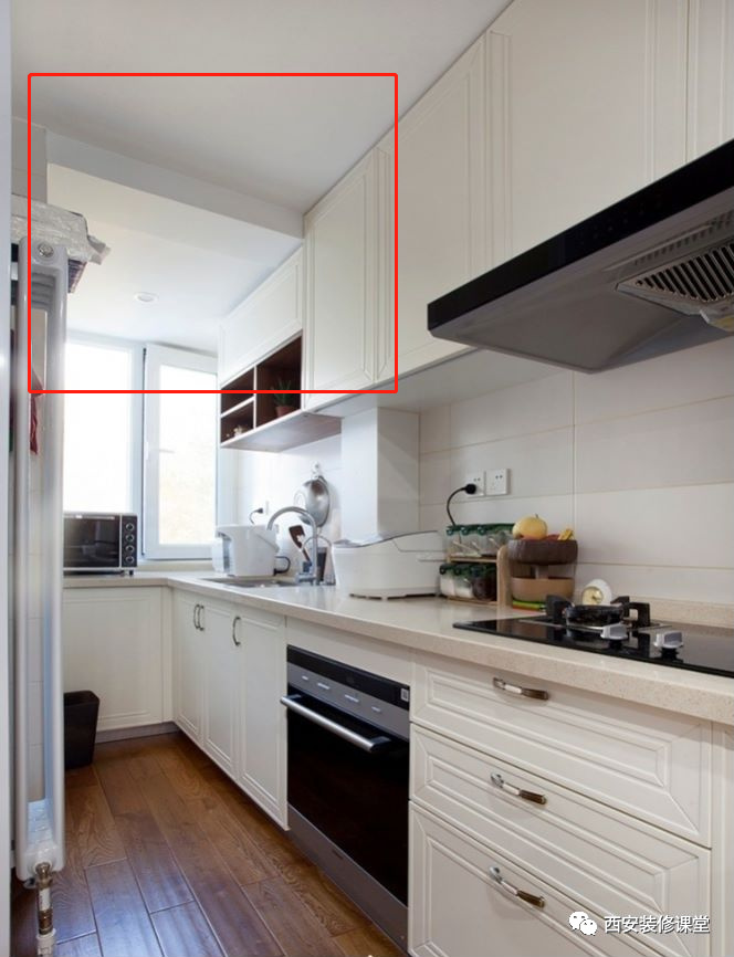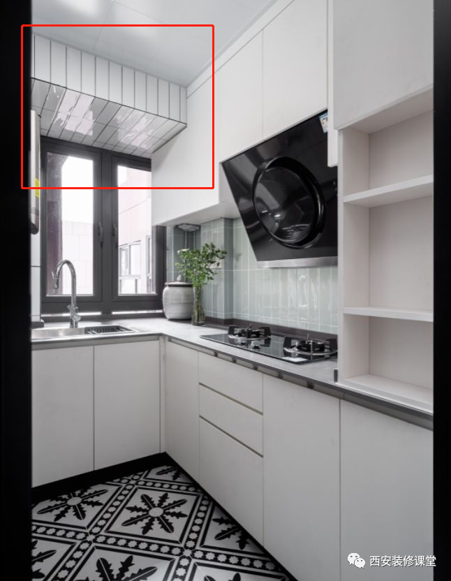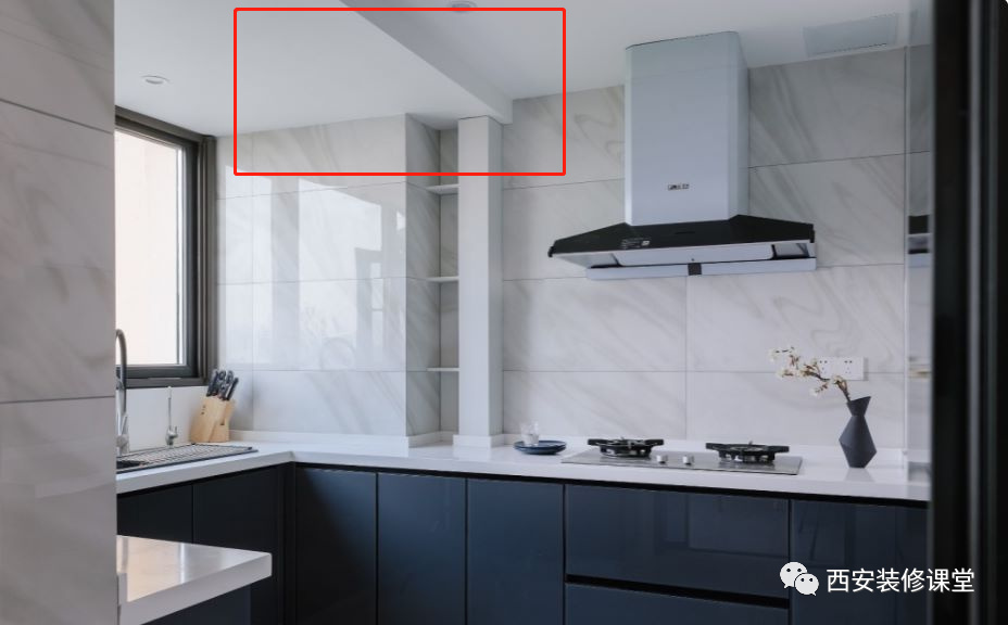 ▲如图厨房窗户上方有个突兀的大梁,此时因为大梁太低,吊顶无法隐藏,只能采用瓷砖铺贴,经典的小白砖白色处理,也能与吊顶颜色搭配,需要注意的是瓷砖最好采用纯胶粘贴,防止小面积瓷砖时间久了脱落