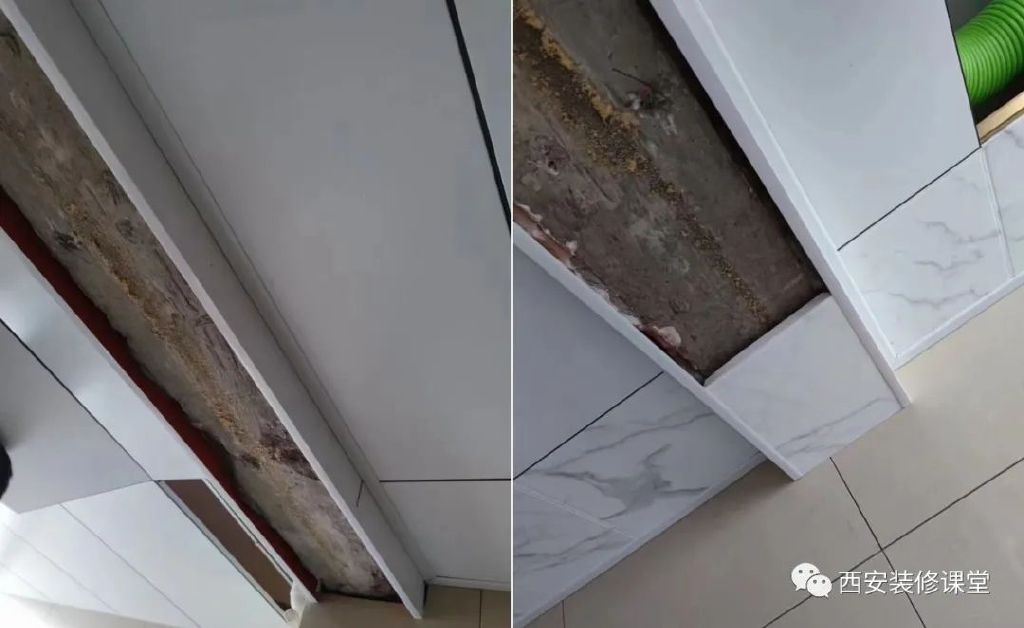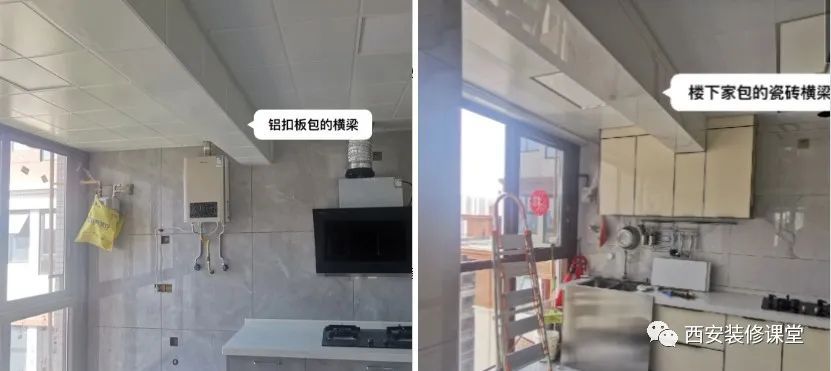 ▲如图,左图是铝扣板包横梁,颜色一体,消除了安全隐患;右图采用瓷砖包大梁,一是瓷砖颜色本身与吊顶颜色不一致,同时大梁上瓷砖更容易脱落