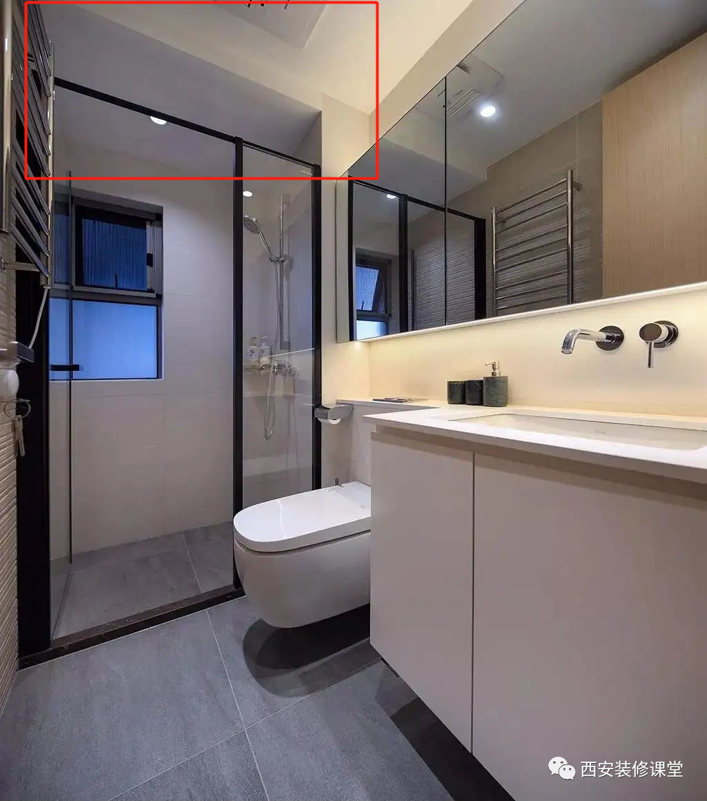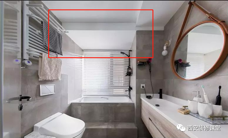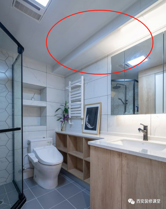 ▲如图卫生间一边有大梁而且很低,此时不可能压低整体吊顶,只能采用同色铝扣板装饰大梁,让整体看起来是一个颜色;如果大梁直接铺贴瓷砖,后期容易脱落而且视觉上看起来更突兀,不如吊顶材料装饰,更能弱化和消除隐患