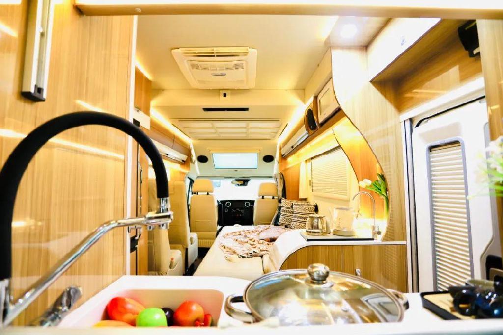 一体成型开模工艺的白色台面上方配置有嵌入式智能茶台,整车还配置有房车专用净水系统,便于用户接水煮茶。细节方面,厢体一侧配置了欧普五孔插座,上方配置了倒挂置杯架,放置酒杯后,整个区域氛围感满满。