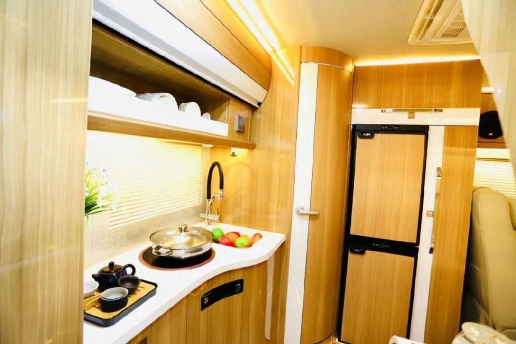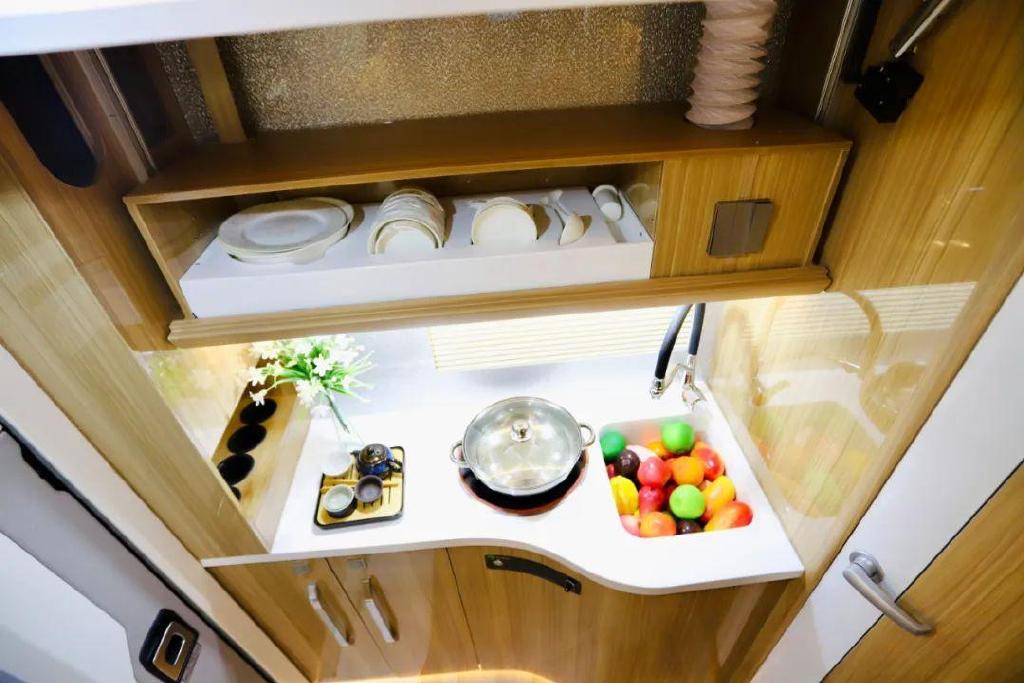 尾门上方为整车的中控面板区域,旁侧为四路监控显示屏,便于随时观察车外情况。厨房区位于尾门另一侧,采用了一体成型独立开模工艺台面,美观实用,台面上配备有内嵌水池+可抽拉水龙头、内置柴油炉(国家发明专利产品),区域内还配备了硅胶材质置杯架、韩国大宇微波炉、房车专用152L大容积冰箱等,上下方均作了储物空间的设计,保障了出行丰富的储物需求。