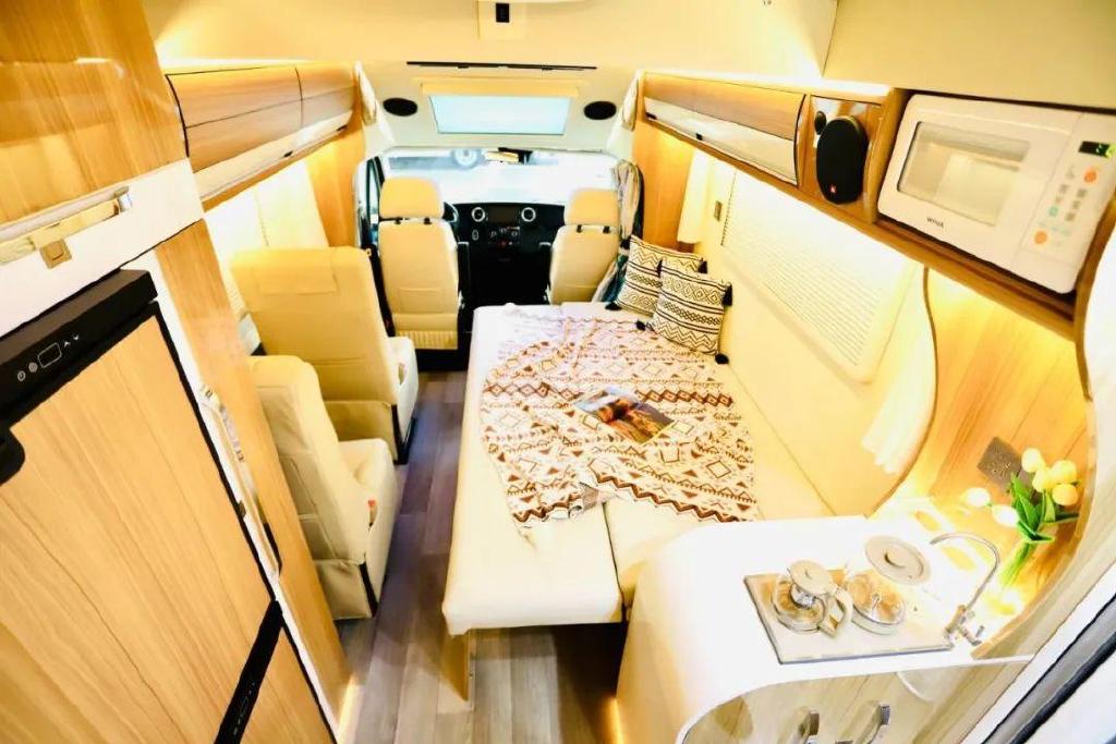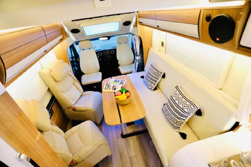 整车为尾门的设计,生活区采用了原木色内饰布局,家具采用钢琴高光免漆板,高级有质感,桌面边缘采用了圆弧形设计,安全美观。进门处设计有小鞋柜,便于上下车换鞋,保持车内整洁。
