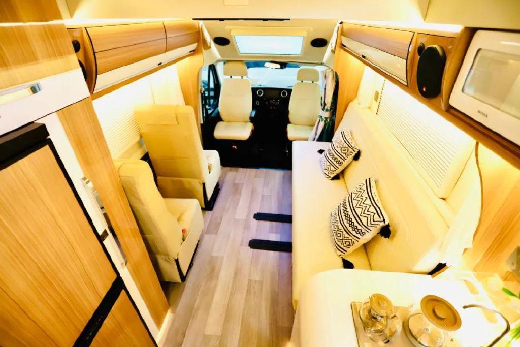 来自飞翔的畅享家T型房车,整车基于依维柯底盘打造,内饰为后置厨卫布局,车内配备了豪华双航空座椅,旅居舒适性倍增,多功能会客区可以变成床铺使用,配合车顶的隐藏升降吊床,两处大空间的休息区满足一大家的出行睡卧需求,大水电为舒适旅居提供保障,一起详细了解。