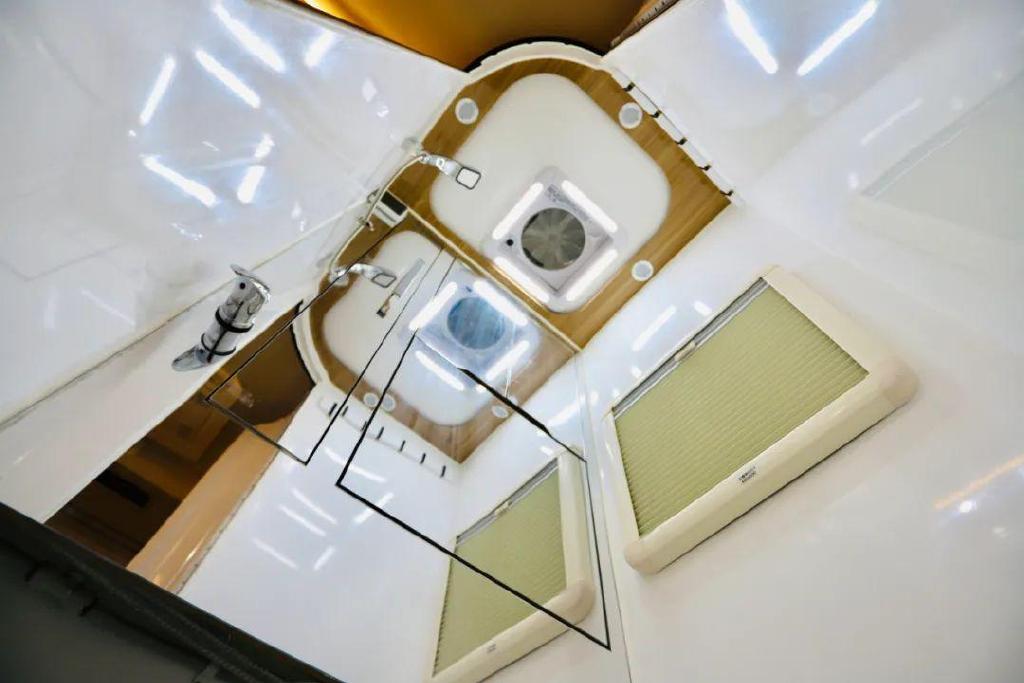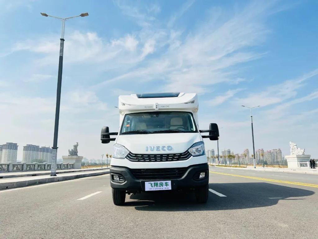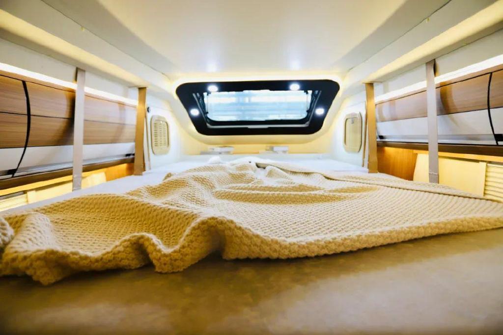 夜晚休息时,可以将单排座椅拉出变形为一张可供人睡卧的床铺。除了这个睡卧空间外,飞翔还在顶部设计了一张隐藏的升降吊床,尺寸为1.3*2m,两个大面积的睡卧空间能够满足一家人的使用需求。行车娱乐方面,飞翔为这款车配备了一台32寸的网络电视,匹配有JBL音响,即刻享受私人影院。