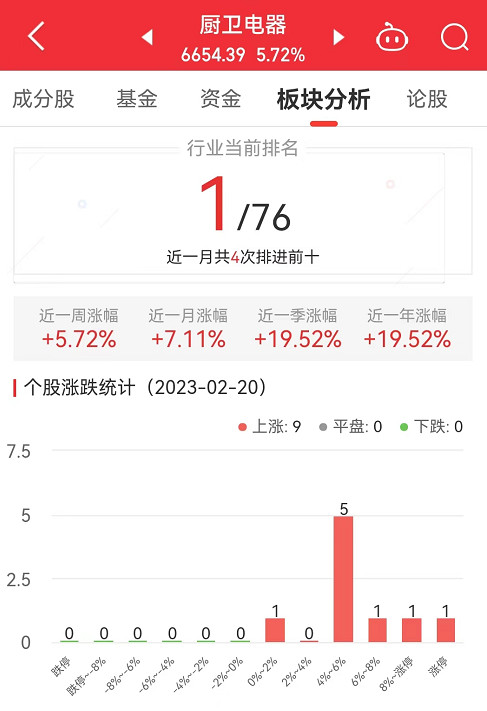 中国经济网北京2月20日讯 今日,厨卫电器板块整体涨幅5.72%,其中,9只股票上涨。?????? ?