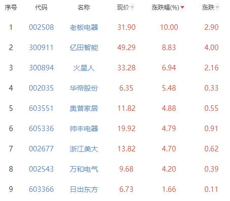 其中,老板电器、亿田智能、火星人、华帝股份、奥普家居、帅丰电器、浙江美大、万和电气、日出东方涨幅分别为10.00%、8.83%、6.94%、5.48%、4.88%、4.79%、4.70%、4.20%、1.66%。 ?