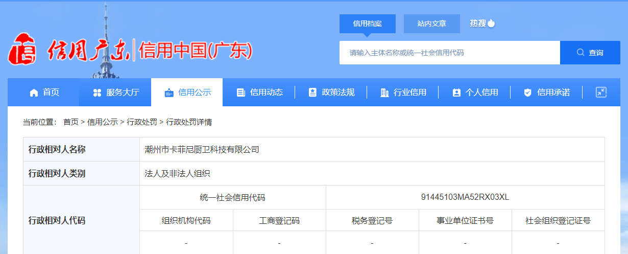 中国质量新闻网讯 近日,信用中国(广东)网站公开一则行政处罚信息,涉及潮州市卡菲尼厨卫科技有限公司(行政处罚决定书文号:安市监古处字〔2023〕1号)。