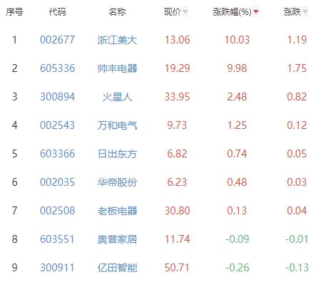 其中,浙江美大、帅丰电器、火星人、万和电气、日出东方、华帝股份、老板电器、奥普家居、亿田智能涨幅分别为10.03%、9.98%、2.48%、1.25%、0.74%、0.48%、0.13%、-0.09%、-0.26%。