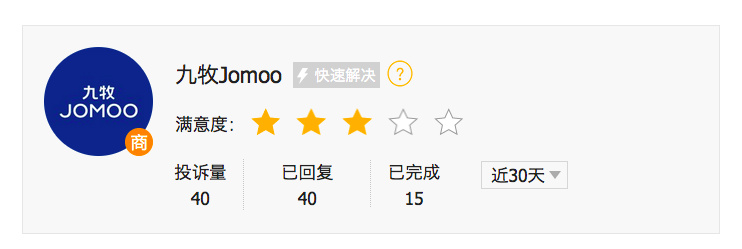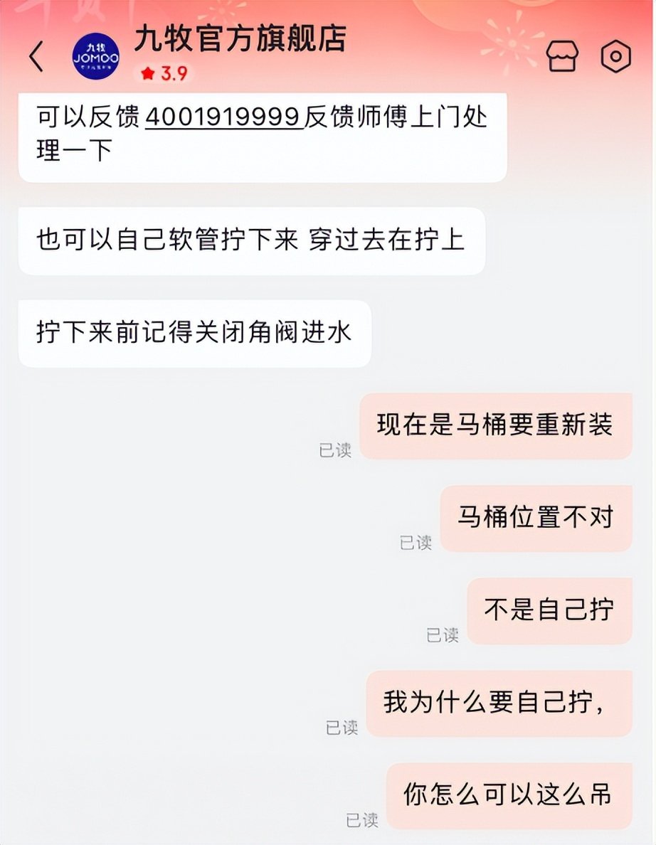 1月3日一位九牧的消费者投诉称“服务态度差,业务能力差”,原因是该用户在买完九牧的马桶后,安装环节遇到了一个小问题,安装的师傅没有将管道按说明书穿过马桶的孔洞中,而是在马桶与墙壁之间通过,导致马桶并未紧贴墙面。这位用户向安装师傅提出异议后,该师傅要用户跟客服联系。