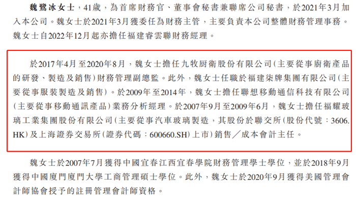 魏鹭冰自2022年12月起亦担任福建睿云联财务经理;于2017年4月至2020年8月,担任九牧厨卫股份有限公司(主要从事厨卫产品的研发、制造及销售)财务管理副总监。