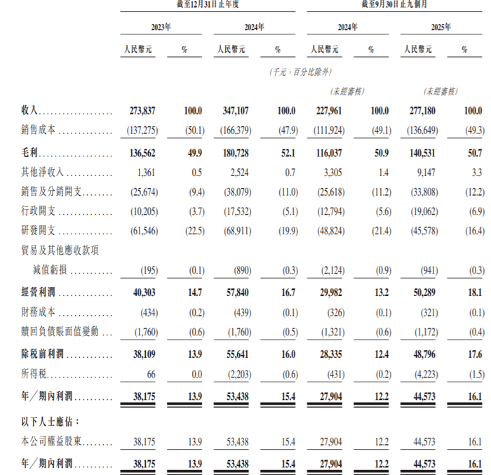 业绩方面,2023年、2024年及2025年前9个月,睿云联创营收分别为2.74亿、3.47亿元及2.77亿元;期内利润分别为3818万、5344万元及4457.3万元。